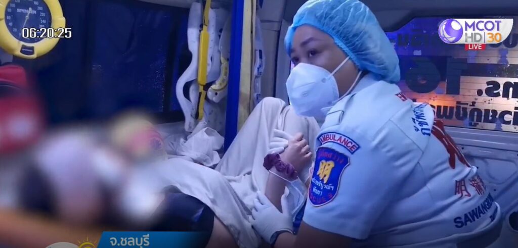 ในที่เกิดเหตุพบหญิงชาวรัสเซีย อายุ 38 ปี ได้รับบาดเจ็บศีรษะแตก บริเวณลำคอมีรอยเขียวช้ำ ตามร่างกายมีบาดแผลถลอก สวมชุดวิ่งออกกำลังกาย จากการสอบถามเบื้องต้นผู้บาดเจ็บจำอะไรไม่ได้เลย เจ้าหน้าที่จึงรีบนำตัวผู้บาดเจ็บส่งโรงพยาบาลบางละมุง