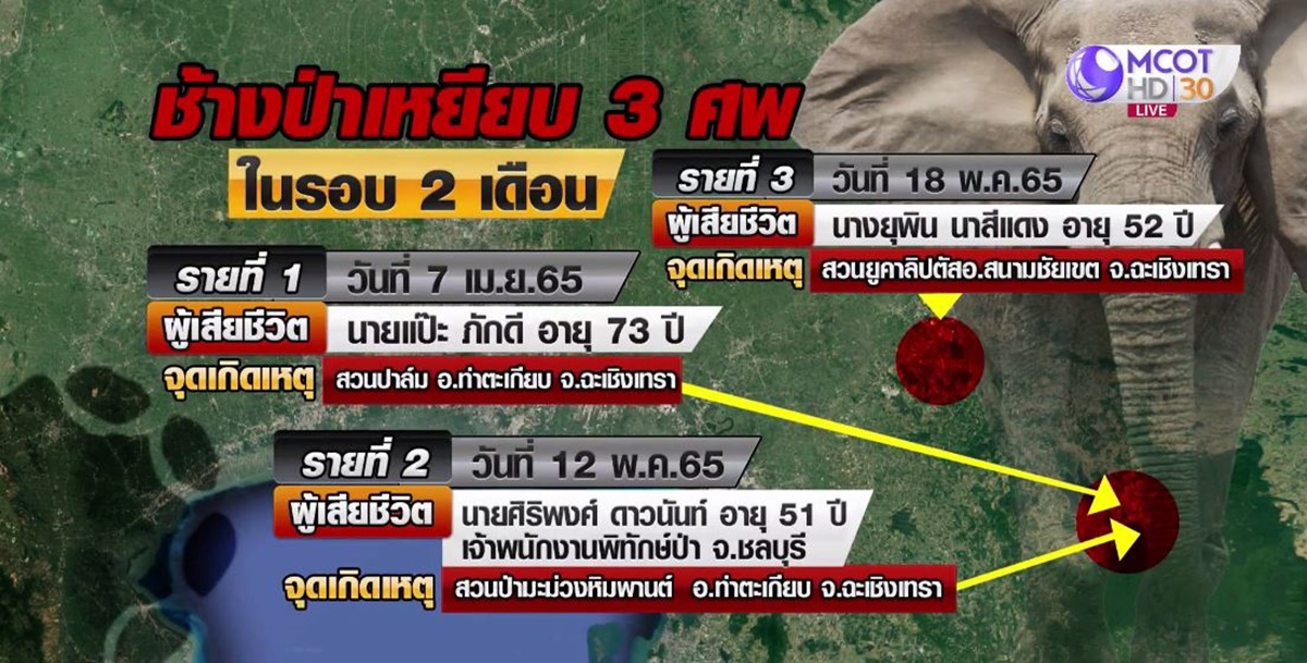 ทั้งนี้ ในช่วง 2 เดือนที่ผ่านมา คือ เมษายน-พฤษภาคม 2565 มีผู้ถูกช้างป่าทำร้ายจนเสียชีวิตแล้วถึง 3 ราย รายแรก เมื่อวันที่ 7 เม.ย. นายแป๊ะ อายุ 73 ปี ถูกช้างป่าทำร้ายจนร่างแหลก ขณะเข้าไปตัดปาล์มในสวน พื้นที่หมู่ 5 บ้านหนองปรือกันยาง ต.ท่าตะเกียบ อ.ท่าตะเกียบ จ.ฉะเชิงเทรา รายที่ 2 เมื่อวันที่ 12 พ.ค. นายศิริพงศ์ ดาวนันท์ อายุ 51 ปี เจ้าพนักงานพิทักษ์ป่า สำนักงานพื้นที่อนุรักษ์ที่ 2 (ศรีราชา) จ.ชลบุรี ถูกช้างป่าทำร้ายจนกระดูกหักไปทั้งตัว ระหว่างเข้าไปภายในสวนป่ามะม่วงหิมพานต์ที่ตนเองปลูกไว้ พื้นที่หมู่ 7 ต.ท่าตะเกียบ อ.ท่าตะเกียบ จ.ฉะเชิงเทรา ห่างจากฐานปฏิบัติการป้องกันรักษาป่าที่ ฉช.2 บ้านหนองปลาซิว เพียง 700 เมตร และรายที่ 3 วันที่ 18 พ.ค. นางยุพิน อายุ 52 ปี ถูกช้างป่าทำร้าย ขณะเข้าไปในสวนยูคาลิปตัสของตัวเอง. – สำนักข่าวไทย