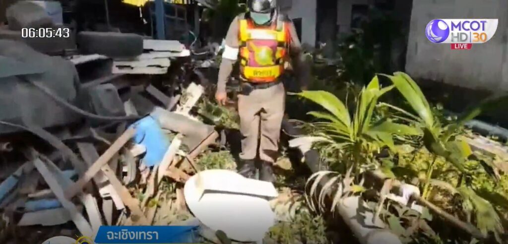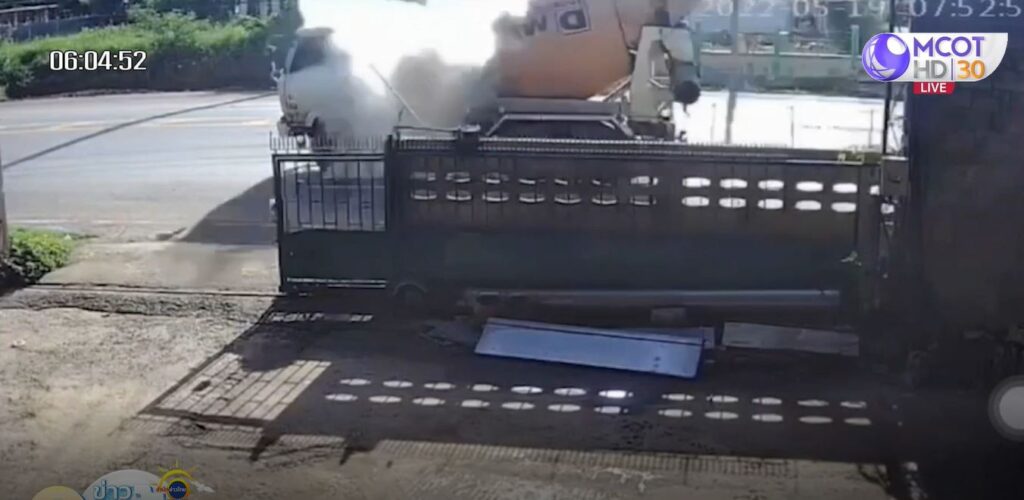 ฉะเชิงเทรา 20 พ.ค. – ถังบรรจุน้ำแรงดันสูงรถโม่ปูนระเบิดกลางถนน ฝาปิดถังพุ่งตัดสายไฟฟ้าแรงสูงได้รับความเสียหาย ก่อนหล่นใส่หลังคาโกดังข้างทาง