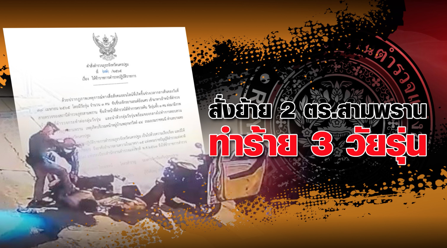 ในหนังสือคำสั่งระบุว่า ด้วยปรากฏภาพเหตุการณ์ทางสื่อสังคมออนไลน์ที่เกิดขึ้นช่วงเวลากลางคืนของวันที่ 30 เมษายน มีวัยรุ่น จำนวน 3 คน ขับขี่รถจักรยานยนต์ย้อนศร เข้ามาหาเจ้าหน้าที่ตำรวจสายตรวจของสถานีตำรวจภูธรสามพราน เจ้าหน้าที่ตำรวจได้ทำการตรวจค้น วัยรุ่นทั้ง 3 คน ต่อมามีภาพเจ้าหน้าที่ตำรวจกระทำต่อกลุ่มวัยรุ่น และนำตัวกลุ่มวัยรุ่นพร้อมของกลางไปทำการสอบสวน ที่สถานีตำรวจภูธรสามพราน เหตุเกิดบริเวณหน้าหมู่บ้านพฤกษาวิลล์ 44 ถนนบรมราชชนนี ตำบลบางเตย อำเภอสามพราน จังหวัดนครปฐม เพื่อให้การปฏิบัติรายการเป็นไปด้วยความเรียบร้อย และมิให้เกิดความเสียหายต่อราชการ จึงอาศัยอำนาจ ตามความในมาตรา 15 แห่งพระราชบัญญัติตำรวจแห่งชาติ พ.ศ.2547 และระเบียบสำนักงานตำรวจแห่งชาติ พ.ศ.2563 ให้ ร.ต.อ.ไชยะพจน์ รองสารวัตรป้องกันปราบปรามสถานีตำรวจภูธรสามพราน และ ส.ต.ต.พนาดร ผู้บังคับหมู่ ไปปฏิบัติราชการที่ศูนย์ปฏิบัติการตำรวจภูธรจังหวัดนครปฐม โดยขาดจากการปฏิบัติหน้าที่ทางตำแหน่งเดิม ตั้งแต่บัดนี้เป็นต้นไป จนกว่าจะมีคำสั่งเปลี่ยนแปลง สั่ง ณ วันที่ 20 พฤษภาคม พ.ศ.2565.-สำนักข่าวไทย