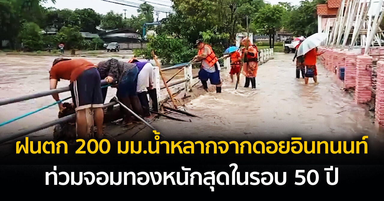 ฝนที่ตกหนักบนดอยอินทนนท์ตลอดคืนที่ผ่านมา (20 พ.ค.) วัดได้ถึง 200 มิลลิเมตร ทำให้น้ำหลากจากดอยลงลำน้ำทะลักเข้าท่วมบ้านเรือนหลายร้อยหลังในอำเภอจอมทอง หนักสุดในรอบ 50 ปี บางจุดระดับน้ำยังสูงกว่า 1 เมตร