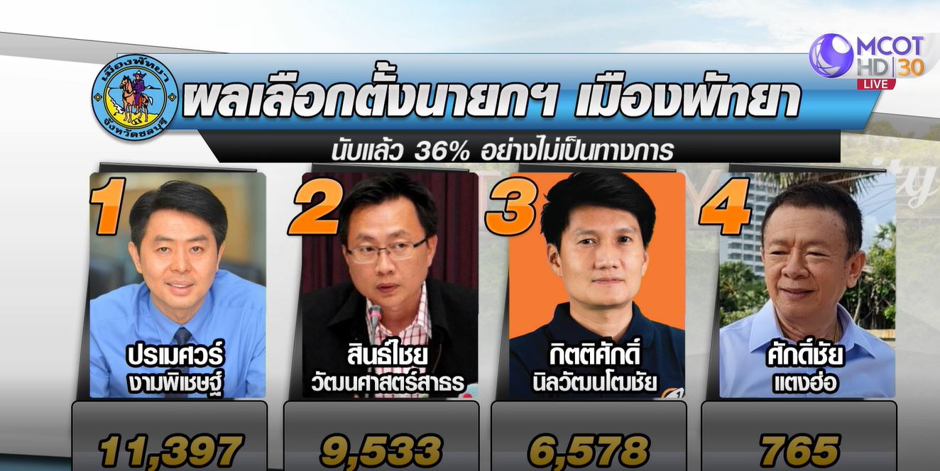 ภาพรวมในการลงคะแนนเสียงเลือกตั้งของชาวเมืองพัทยาเป็นไปด้วยความเรียบร้อย ซึ่งมีผู้มาใช้สิทธิเกิน 50% เกือบเกือบจะ 70% ตามที่เจ้าหน้าที่ได้ตั้งเป้าเอาไว้ และหลังจากปิดหีบในเวลา 17.00 น. หลังจากนั้นเจ้าหน้าที่แต่ละหน่วยเลือกตั้งจะนับคะแนนที่บริเวณหน่วยเลือกตั้งเลย ก่อนจะนำใบคะแนนมารวมกันที่ชั้น 4 ของศาลาว่าการเมืองพัทยา นับคะแนนไปได้ประมาณ 36.24% ปรากฏว่าผลนับคะแนนล่าสุด ขณะนี้นายปรเมศวร์ งามพิเชษฐ์ ผู้สมัครหมายเลข 1 กลุ่มเรารักพัทยา มีคะแนนนำเป็นอันดับ 1 อยู่ที่ 11,397 คะแนน อันดับ 2 คือ นายสินธ์ไชย วัฒนศาสตร์สาธร ผู้สมัครอิสระ หมายเลข 4 จากทีมพัทยาร่วมใจ คะแนน 9,533 คะแนน อันดับ3 คือ นายกิตติศักดิ์ นิลวัฒนโฒชัย คณะก้าวหน้าพัทยา หมายเลข 3 คะแนน 6,578 และอันดับ 4 คือ นายศักดิ์ชัย แตงฮ่อ ผู้สมัครอิสระ หมายเลข 2 คะแนน 765 คะแนน
