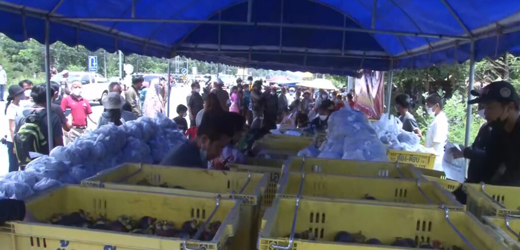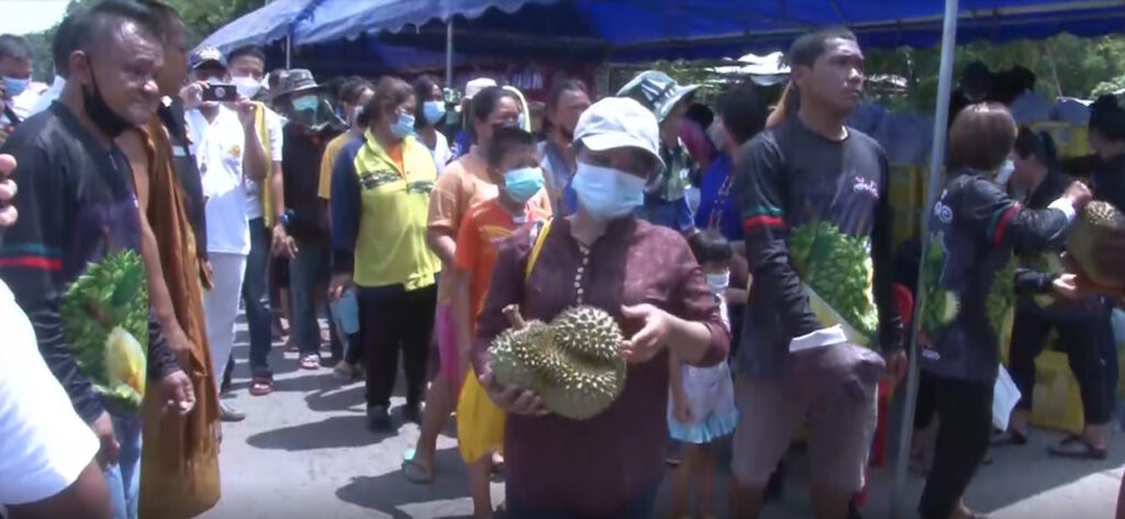 มหาสารคาม 30 เม.ย. – วัดป่าวังน้ำเย็น จ.มหาสารคาม ออกโรงทานแจกผลไม้ ทั้งทุเรียน เงาะ มังคุด และลองกอง สดจากสวนจันทบุรี ระยอง รวมกว่า 10 ตัน ประชาชนมารอคิวยาวเหยียด ท่ามกลางอากาศร้อนระอุ