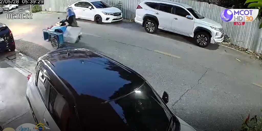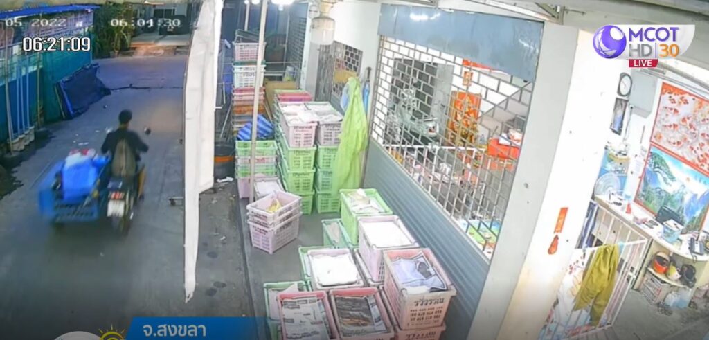 ภาพวงจรปิดเผยให้เห็นเหตุการณ์ขณะคนร้ายขี่รถจักรยานยนต์สามล้อพ่วงข้างผ่านเข้าไปในซอย 8 ถนนคลองเรียน อ.หาดใหญ่ จ.สงขลา เมื่อช่วง 05.30 น. วันที่ 28 พฤษภาคมที่ผ่านมา แล้ววกกลับมาจอดหน้าบริษัท โดยใช้ตะกร้าพลาสติกคลุมศีรษะอำพรางใบหน้า ก่อนลงไปหยิบกระเป๋าเดินทางขี่รถออกไป