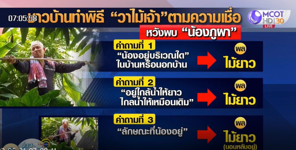 ด้านชาวบ้านได้ให้ผู้เฒ่าผู้แก่ในหมู่บ้านทำพิธีวาไม้เจ้าที่ที่บ้าน ตั้งคำถามน้องภูผาว่าอยู่แถวไหน คำถามแรกว่าน้องอยู่บริเวณในบ้าน หรือบริเวณนอกบ้าน หากอยู่ใกล้บ้านให้ไม้ยาวออกจากเดิม ผลปรากฏว่าไม้ยาวออกประมาณ 10 เซนติเมตร คำถามที่ 2 ถามว่าอยู่ใกล้น้ำให้ยาว แต่หากไม่ได้อยู่ใกล้น้ำให้เหลือเท่าเดิม ผลปรากฏว่าไม้ยาว และคำถามที่ 3 ลักษณะที่เป็นอยู่ นอนหรือร้องไห้ ผลปรากฏว่าไม้ยาว คือนอนหลับอยู่ จากนั้นจึงระดมกำลังค้นหาอีกรอบบริเวณหนองน้ำ