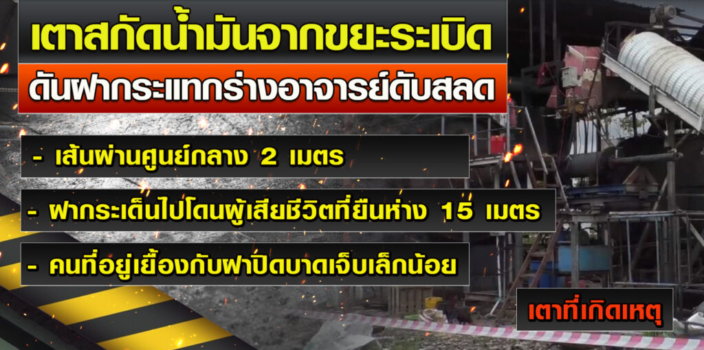 สกลนคร 4 มิ.ย.-เหตุอาจารย์หนุ่มจาก ม.ขอนแก่น ทำโครงการสกัดน้ำมันจากพลาสติกด้วยเตาขนาดใหญ่ เกิดระเบิด เป็นเหตุให้ตัวเองเสียชีวิต เพื่อนอาจารย์บาดเจ็บ ด้านสำนักช่างเทศบาลสกลนครลงพื้นที่เร่งหาสาเหตุ ยืนยันเตาเผาขยะของเทศบาลฯ ได้มาตรฐานก่อสร้างและกำจัดขยะ