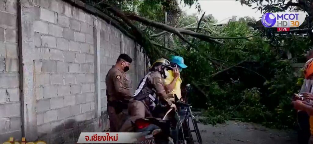 กิ่งขนาดใหญ่ของต้นประดู่ยักษ์ความสูงกว่า 10 เมตร ในที่ดินเอกชน บริเวณซอยทุ่งพัฒนา ถนนซุปเปอร์ไฮเวย์ ตำบลช้างเผือก อำเภอเมืองเชียงใหม่ แบกรับน้ำหนักไม่ไหว หักจากลำต้นทับสายไฟฟ้าแรงต่ำ และขวางกลางซอยทุ่งพัฒนา บางส่วนยังทับซุ้มประตูบ้านคุณยายวัย 75 ปี โชคดีคนในบ้านปลอดภัย แต่ออกมาจากบ้านไม่ได้ เจ้าหน้าที่ต้องเอาบันไดพาดกำแพงความสูงกว่า 2 เมตร ให้ยายที่อยู่ในบ้านปีนข้ามออกมา ทั้งประสานเจ้าหน้าที่ไฟฟ้ามาตรวจสอบกระแสไฟฟ้า เนื่องจากถูกกิ่งไม้บางส่วนทับอยู่