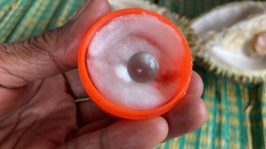 จากการสอบถามนายสมคิด อายุ 41 ปี เจ้าของวัตถุดังกล่าว เล่าว่า เมื่อประมาณ 2-3 วันที่ผ่านมา เวลาตอนเย็น ตนเองกลับมาจากเฝ้ากระชังปลาให้นายจ้าง รู้สึกอยากจะกินลูกทุเรียน จึงได้ไปซื้อทุเรียนพันธุ์พื้นบ้านที่ร้านอาหารของนายจ้าง ซึ่งอยู่ใกล้กับที่จอดเรือของตน จากนั้นก็นำลูกทุเรียนมาแกะกินที่บ้าน มีแม่เลี้ยงและหลานชายนั่งกินด้วยกัน พอตนกัดพูแรกรู้สึกว่าฟันไปกระทบกับวัตุบางอย่างลักษณะเป็นเม็ดแข็ง ๆ จนทำให้ฟันบิ่น จึงรีบคายออกมาต่อหน้าแม่เลี้ยง ที่กำลังนั่งกินด้วยกัน พอคายออกมาปรากฏว่า เป็นลูกแก้วดังกล่าว อยู่ติดกับเม็ดทุเรียนที่ตนกินเข้าไป จึงตรวจสอบเปลือกทุเรียนก็ไม่พบร่องรอยทะลุแต่อย่างใด เปลือกทุเรียนก็สมบูรณ์ดี หากมีการยัดลูกแก้วเข้าไปในเนื้อทุเรียนคงจะมีรอยบ้าง เนื้อทุเรียนอาจจะมีรอยช้ำ แต่ก็ไม่เห็นมี จึงเชื่อว่าวัตุดังกล่าวออกมาจากทุเรียน และคงจะเป็นของมีค่า มีราคา หลังจากนี้ตนจะเอาไปฝากไว้กับญาติและพร้อมที่จะให้มีการพิสูจน์