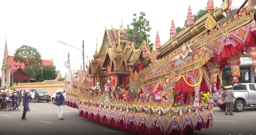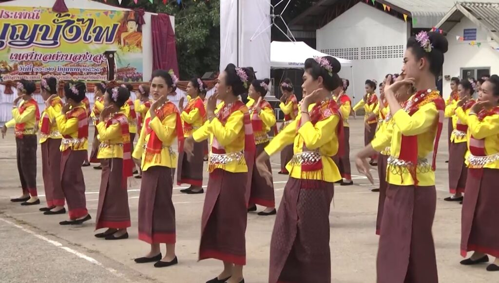 ขบวนนางรำกว่า 300 ชีวิต พร้อมขบวนแห่บั้งไฟที่ประดับตกแต่งสวยงาม มีประชาชนและนักท่องเที่ยวให้ความสนใจออกมาชมพร้อมทั้งเก็บภาพความประทับใจ ดูการฟ้อนรำ ฟังดนตรีสนุกสนาน หลังจากกิจกรรมนี้ห่างหายไปในช่วงที่มีการแพร่ระบาดของเชื้อโควิด-19 นานร่วม 2 ปี โดยการจัดงานเป็นประเพณีจากความเชื่อในช่วงกำลังจะสิ้นฤดูแล้ง ย่างเข้าฤดูฝน ในพื้นที่หมู่บ้านที่อากาศยังแห้งแล้งอยู่ฝนไม่ตก ราษฎรในหมู่บ้านจึงจัดประเพณีเพื่อเป็นการขอฝน ทำให้ฝนตกตามฤดูกาล ผลผลิตทางการเกษตรเพิ่มมากขึ้น .-สำนักข่าวไทย