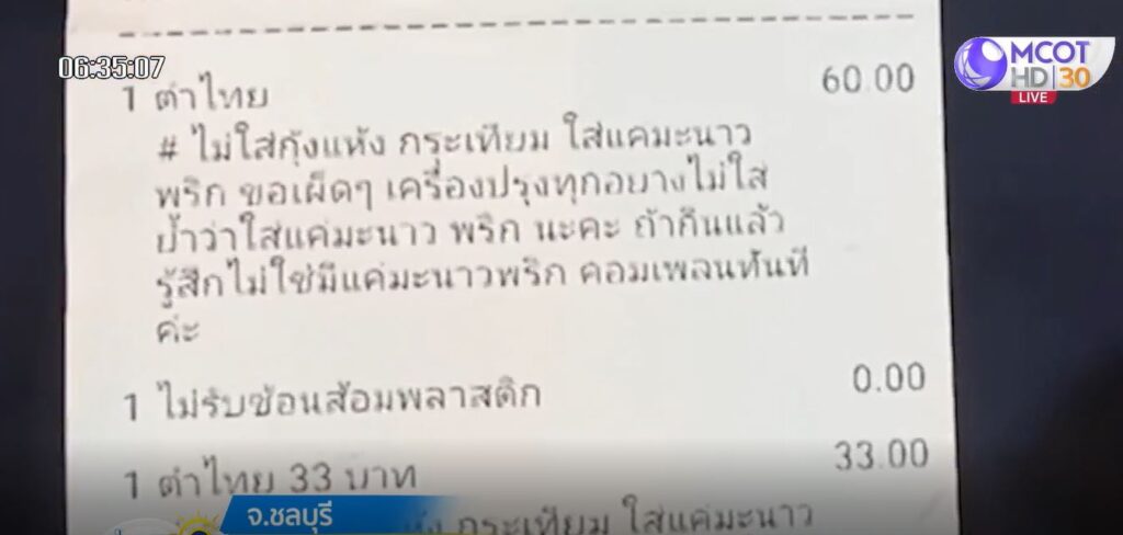ในใบเมนูเขียนว่า “1. ตำไทย ไม่ใส่กุ้งแห้ง กระเทียม ใส่แค่มะนาว พริกขอเผ็ดๆ เครื่องปรุงทุกอย่างไม่ต้องใส่ ย้ำว่าใส่แค่มะนาว พริก นะคะ ถ้ากินแล้วรู้สึกไม่ใช่แค่มะนาวกับ พริก คอมเพลนทันที” ทางร้านทำตามออเดอร์ แล้วแยกน้ำและเส้นให้ แต่ลูกค้ารายนี้โทรกลับมาด่าว่าทำไม่อร่อย