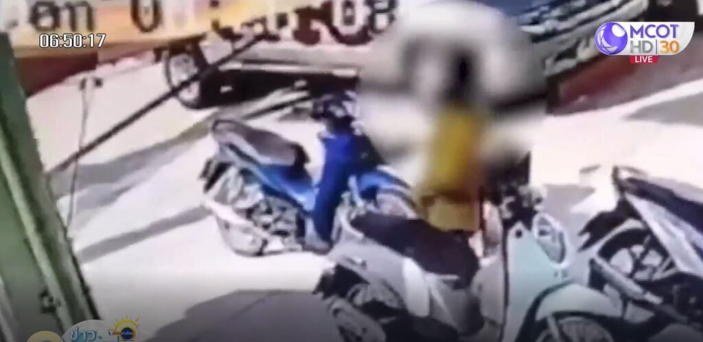 กล้องวงจรปิดจับภาพคนร้ายขี่รถจักรยานยนต์สีน้ำเงินเข้ามาหน้าร้านสะดวกซื้อ ก่อนขโมยไก่สดที่แขวนอยู่หน้ารถของแม่ค้าขายไก่ทอด หลังจากนั้นรีบเดินกลับไปขึ้นรถจักรยานยนต์ขี่หลบหนีไปอย่างรวดเร็ว