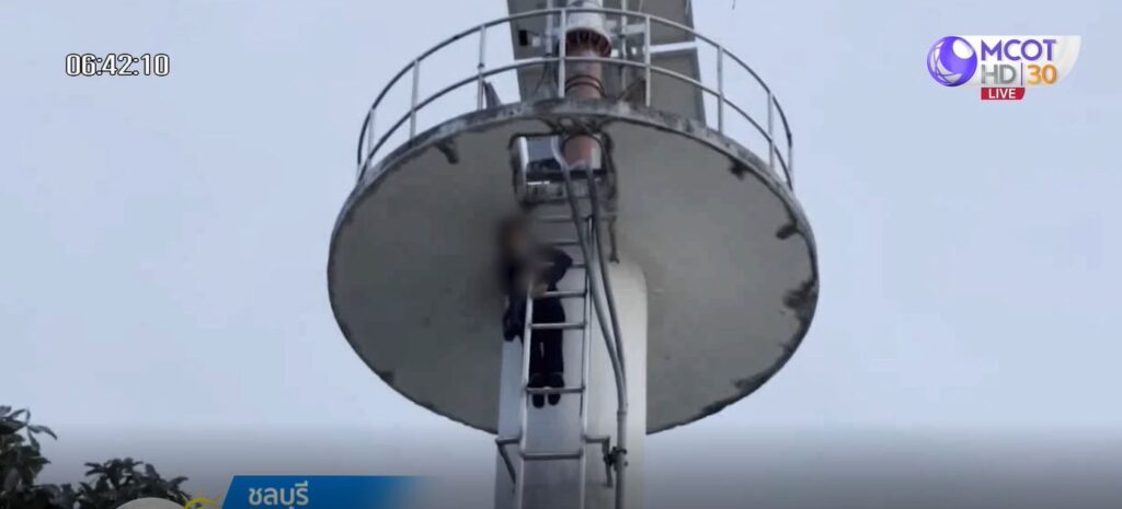 ชลบุรี 16 มิ.ย. – หนุ่มชาวจีนเครียด ถูกโกงเงินกว่า 1 ล้านบาท และถูกคู่กรณีข่มขู่ ปีนหอคอยเตือนภัยสึนามิ ริมหาดจอมเทียน พัทยา เจ้าหน้าที่ส่งล่ามแปลภาษาปีนขึ้นไปเจรจาจึงยอมลงมาด้านล่างอย่างปลอดภัย