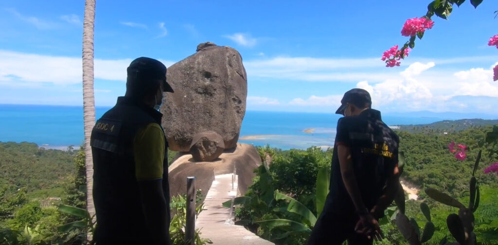 กอ.รมน.ภาค 4 พื้นที่เกาะสมุย ร่วมกับ สภ.บ่อผุด เทศบาลนครเกาะสมุย เข้าตรวจสอบสถานที่ท่องเที่ยวจุดชมวิว “โอเวอร์แลปสโตน” ของเอกชนรายหนึ่ง บนเขาละไม อ.เกาะสมุย จ.สุราษฎร์ธานี เปิดให้นักท่องเที่ยวเข้าชมหินก้อนใหญ่บนหน้าผา เก็บค่าเข้าคนละ 50 บาท โดยผู้ประกอบการทำสะพานให้นักท่องเที่ยวเดินข้ามสัมผัสก้อนหินและถ่ายรูป