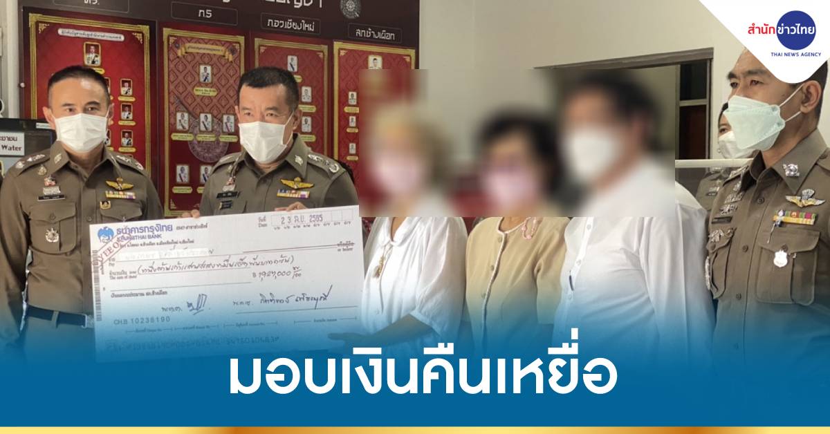 เชียงใหม่ 23มิ.ย.-ผู้บัญชาการภูธรภาค 5 มอบเงินคืนคุณยายวัย 76 ปี ที่ตกเป็นเหยื่อถูกแก๊งมิจฉาชีพหลอกให้โอนเงินสร้างศูนย์แพทย์กว่า 8 ล้านบาท แต่อายัดบัญชีได้ทันเกือบ 2 ล้านบาท