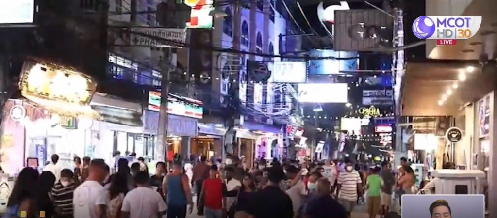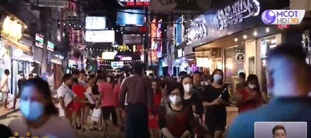บรรยากาศบริเวณถนนวอล์กกิ้งสตรีท พัทยา เริ่มกลับมาคึกคักอีกครั้ง พบว่านักท่องเที่ยวทั้งชาวไทยและชาวต่างชาติบางรายไม่สวมหน้ากากอนามัย แต่มีบางรายยังสวมหน้ากากอนามัยเพื่อความปลอดภัยกับตัวเอง แม้จะมีประกาศผ่อนคลายและไม่ได้บังคับให้สวมหน้ากากแล้วก็ตาม