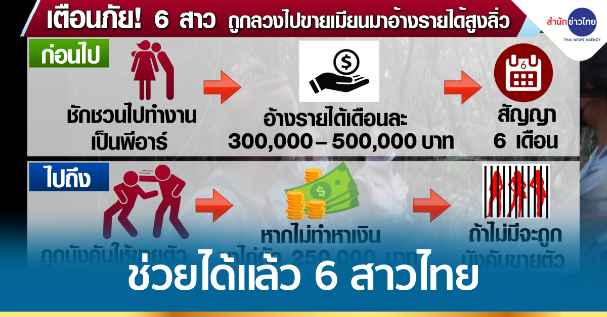 จากกรณีมีหญิงสาวชาวไทย 6 คน เผยแพร่คลิปวิดีโอและภาพนิ่งลงโซเซียลเมื่อช่วงกลางเดือน มิ.ย.ที่ผ่านมา ระบุว่าตอนนี้มีกลุ่มเอเจนซี่หลอกชักชวนหญิงสาวที่เคยทำงานเป็นพีอาร์ให้ไปทำงานเป็นพีอาร์ที่ประเทศเมียนมาจำนวนมาก โดยมีคนพาข้ามช่องทางธรรมชาติที่ อ.แม่สาย จ.เชียงราย บอกว่าจะมีรายได้เดือนละ 300,000-500,000 บาท ทำสัญญา 6 เดือน แต่พอไปถึงจะถูกบังคับให้ขายตัวทันที ใครไม่ทำต้องให้ทางบ้านหาเงินไปไถ่ตัวคนละ 250,000 บาท ให้เวลา 3 วัน ถ้าไม่มีเงินจะถูกบังคับขายตัว ทางเดียวที่จะรอดคือต้องหนีตายเข้าป่า เดินเท้าข้ามวันข้ามคืน หลายคนหลงป่าจนหายสาบสูญ