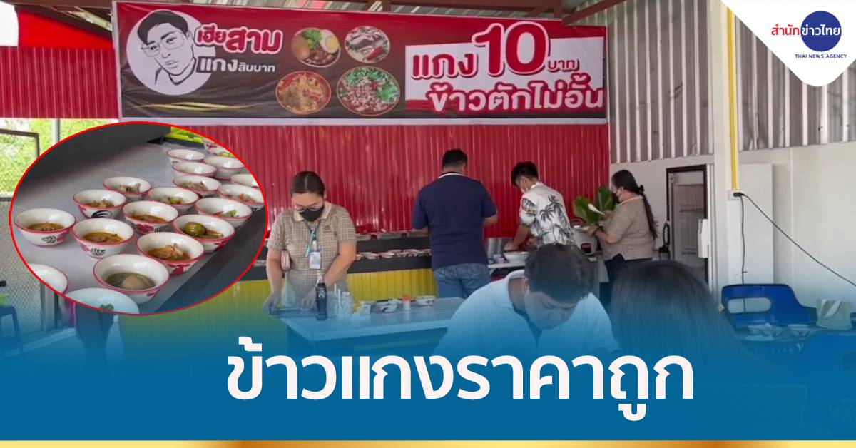 ร้านเฮียสามแกงสิบบาท ข้าวตักไม่อั้น ริมถนนบายพาสขาออก ต.เกิ้ง อ.เมือง จ.มหาสารคาม เสียงตอบรับดีมาก ช่วงเที่ยงคนแห่มานั่งกินกันจนแน่นร้าน น.ส.วิมาลา จิตหนักแน่น เจ้าของร้านเล่าว่า จากที่เคยทำร้านอาหารมาก่อนจากกรุงเทพมหานคร และโดนพิษโควิด แบกรับภาระไม่ไหวต้องเลิกกิจการไป แต่อุปกรณ์ในครัวยังเหลืออยู่ จึงกลับมาเปิดเป็นร้านข้าวแกง 10 บาท นอกจากสถานการณ์โควิดแล้ว ประชาชนยังต้องเผชิญภาวะสินค้าแพง น้ำมันแพง มองว่าอาหารเป็นปัจจัย 4 ที่คนต้องกิน จึงอยากช่วยเหลือคนที่มีรายได้น้อยให้ได้กินอาหารมีคุณภาพ กำไรอาจได้ไม่เยอะ. – สำนักข่าวไทย