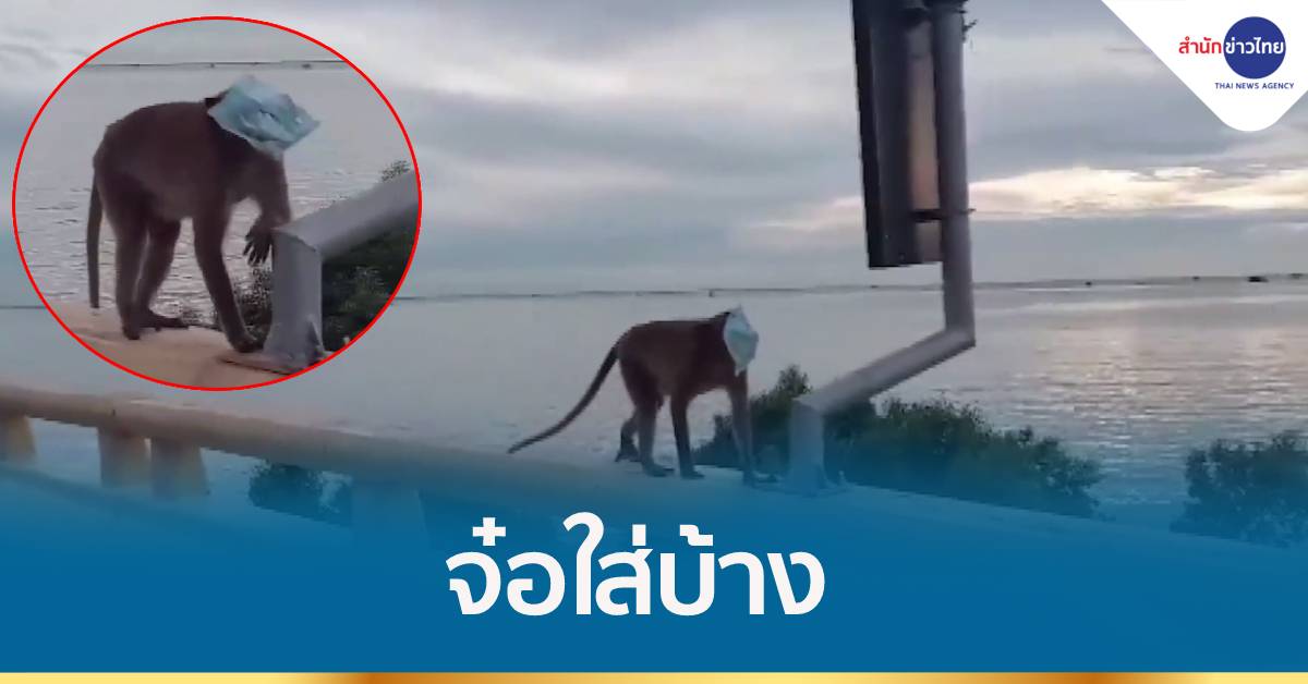 ผู้สื่อข่าวเดินทางไปยังสะพานใหม่ชลบุรี เขตเทศบาลตำบลบางทราย อ.เมือง มีลิงแสมอยู่กันเป็นกลุ่มก้อน เล่นสนุกตามประสา แต่มีอยู่ตัวหนึ่งแยกออกมาเดินเล่นตามลำพัง เอาแมสก์ปิดจมูกขณะเดินบนราวสะพาน ไม่รู้เป็นเพราะเห็นคนใส่แมสก์อยู่เป็นประจำ เลยจำมาใช้ใส่เหมือนคน. – สำนักข่าวไทย
