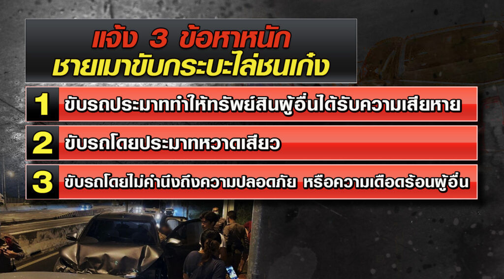 เบื้องต้น เจ้าหน้าที่แจ้ง 3 ข้อหาหนัก คือ 1.ขับรถประมาททำให้ทรัพย์สินผู้อื่นได้รับความเสียหาย 2.ขับรถโดยประมาทหวาดเสียว 3.ขับรถโดยไม่คำนึงถึงความปลอดภัย หรือความเดือดร้อนผู้อื่น ก่อนควบคุมตัวผู้ต้องหาเข้าห้องขัง ดำเนินคดีตามกฎหมายต่อไป .-สำนักข่าวไทย
