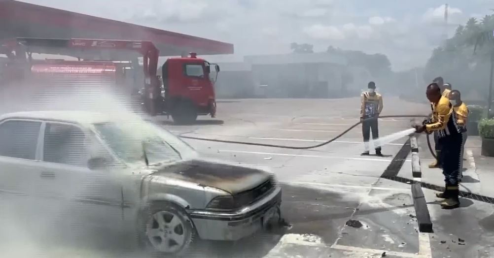 เหตุเกิดก่อนเที่ยงเล็กน้อย เก๋งจอดเติมน้ำมัน อยู่ดีๆ ได้ยินเสียงตุ๊บจากห้องเครื่อง ตกใจเดินไปดู พบไฟกำลังลุกไหม้ใต้ท้องรถ ทั้งคนขับและเด็กปั๊มรีบเข็นรถออกจากหัวจ่าย ก่อนไฟลุมลามไหม้รุนแรงหวิดลามไหม้ปั๊ม เจ้าหน้าที่ดับเพลิงได้รับแจ้งเหตุแล้วรีบพุ่งมาดับไฟทันที