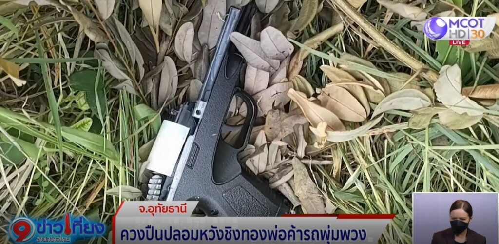 เมื่อเดินกลับไปป่าหญ้าข้างทางจุดเกิดเหตุ พบอาวุธปืนปลอมขนาด 9 มม. ในสภาพลังเพลิงของปืนหายไป ตกอยู่ในป่าหญ้า ห่างจัดเกิดเหตุ 8 เมตร อยากฝากเจ้าหน้าที่เร่งติดตามคนร้ายโดยเร็ว