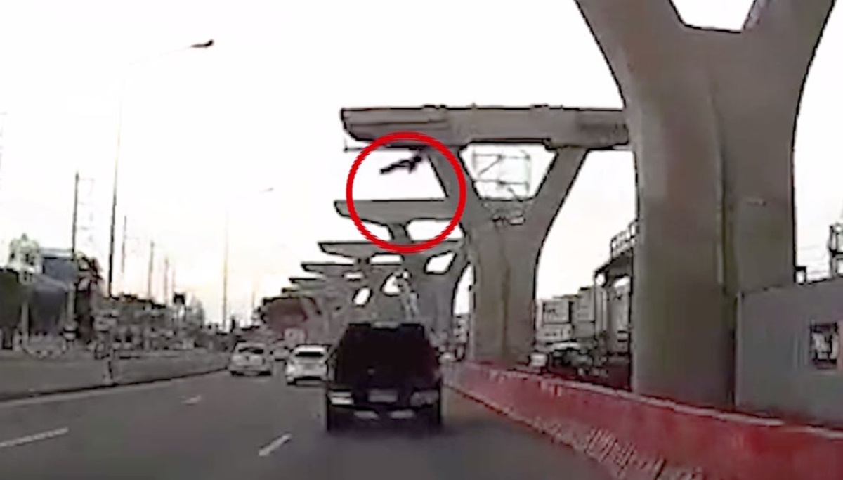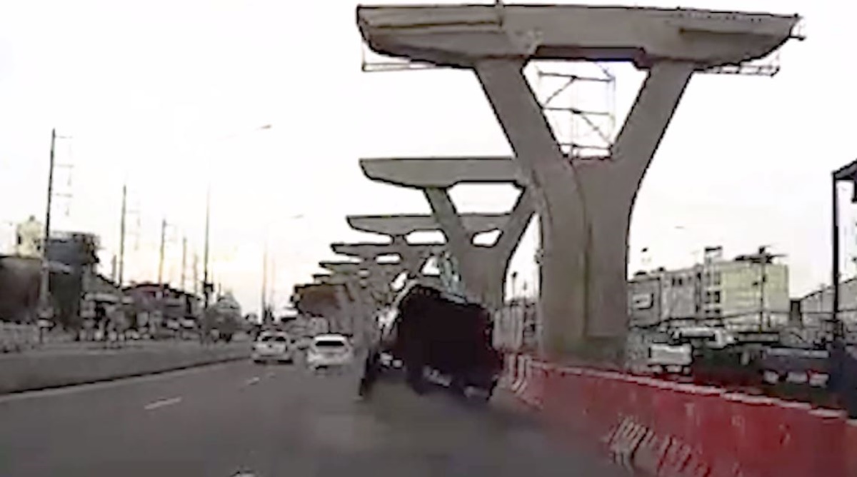 รถกระบะสีดำขับอยู่ช่องจราจรฝั่งขวา บนถนนพระราม 2 ฝั่งขาเข้ากรุงเทพฯ ช่วงที่ขับผ่านบริเวณที่มีการก่อสร้างทางต่างระดับนั้น จู่ๆ ก็มีแท่งเหล็กร่วงหล่นลงมาเฉียดหน้ารถกระบะเพียงเส้นยาแดงผ่าแปด รถกระบะคันดังกล่าวโยกลอยตัว เสียหลักเกือบจะพลิกคว่ำ เคราะห์ดีที่คนขับประคองรถไว้ได้ ก่อนหยุดรถนาทีต่อมา