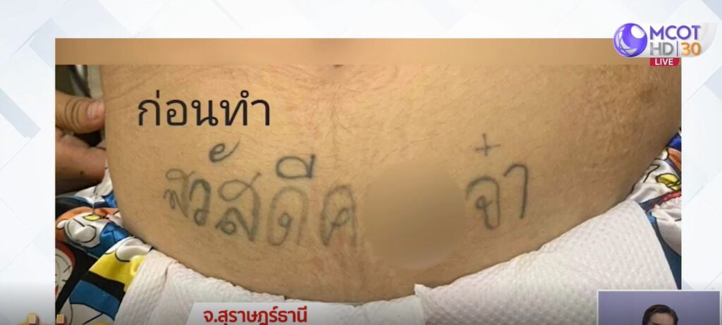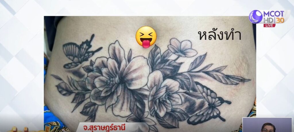 สุราษฎร์ธานี 23 ก.ค. – เห็นแล้วสะดุ้ง! สาวสุราษฎร์ฯ สักข้อความสุดฮือฮาตัวใหญ่หรากลางท้องน้อย เจ้าตัววิ่งแจ้นหาช่างแก้ด่วน หลังแก้เสร็จเรียบร้อย ภาพก่อนและหลังต่างกันลิบลับ ช่างสักฝากเตือนคนที่คิดจะสัก คิดให้รอบคอบก่อนตัดสินใจสัก เพราะลายสักนั้นจะอยู่กับเราไปจนวันตาย