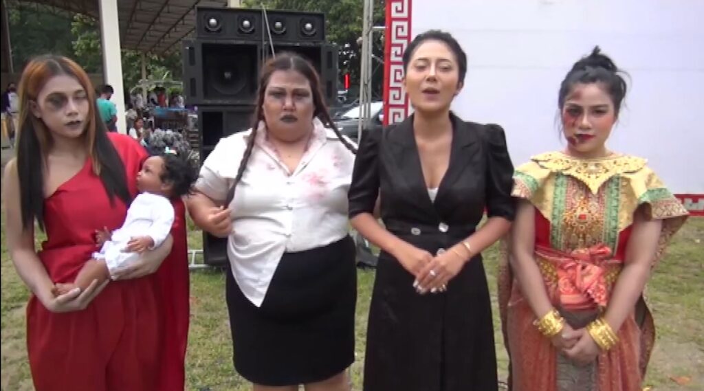 น.ส.ลภัสรดา เปิดเผยว่าเป็นการเลี้ยงขอบคุณเจ้าที่เจ้าทาง คนที่มาร่วมงานมีโชคร่วมกันจึงจัดงานรวมเกือบ 100 คน ได้โชครวมกันกว่า 10 ล้านบาท มีการฉายหนัง 5 จอ จอละ 2 เรื่อง เลี้ยงหมูกระทะ 100 เตา เพื่อขอบคุณที่ให้โชค และแต่งตัวเป็นผี เพราะถือว่าเรามีเพื่อนเป็นผีเลยแต่งผีเป็นเพื่อนเขา เราได้โชคและงานเยอะมาก นอกจากนี้ยังทำโรงทานให้คนได้กินเพื่ออุทิศส่วนกุศลให้กับผีไม่มีญาติ ซึ่งหลุมฝังศพที่นี่มีประมาณ 5,000 หลุม มีการเลี้ยงไก่ทอด หมูหัน กุ้งย่าง ให้ประชาชนได้กินเป็นทาน รวมทั้งซื้อโลงให้กับศพไม่มีญาติด้วย.-สำนักข่าวไทย