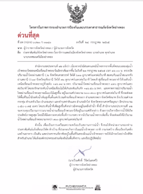 ขณะที่ป้องกันและบรรเทาสาธารณภัยจังหวัดอ่างทอง ออกหนังสือประกาศเตือน 3 อำเภอลุ่มแม่น้ำเจ้าพระยา ประกอบด้วย อ.ไชโย อ.เมือง และ อ.ป่าโมก ให้เตรียมพร้อมรับมือกับระดับน้ำที่จะเพิ่มสูงขึ้น หลังเขื่อนเจ้าพระยาเพิ่มการระบายน้ำเพื่อรองรับน้ำเหนือ. – สำนักข่าวไทย