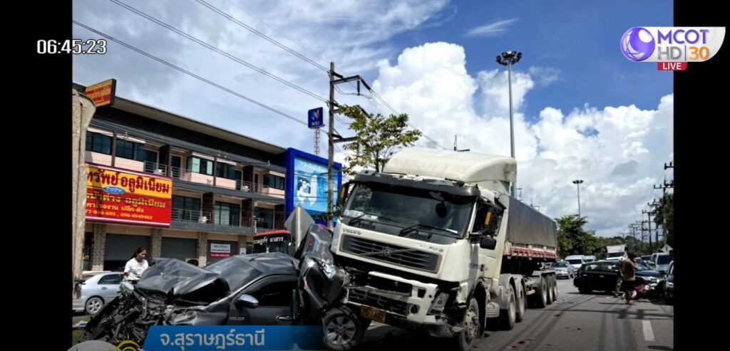 ส่วนที่สุราษฎร์ธานี กล้องวงจรปิดจับภาพรถบรรทุกพ่วงหัวลากเสียหลักชนรถเสียหาย 7 คัน บนถนนสาย 4009 ขาเข้าเมืองสุราษฎร์ธานี สภาพรถที่ถูกชนบางคันพังยับ โชคดีไม่มีผู้เสียชีวิต แต่มีผู้บาดเจ็บ 2 ราย รู้สึกตัวดี กู้ภัยนำส่งโรงพยาบาลสุราษฎร์ธานี