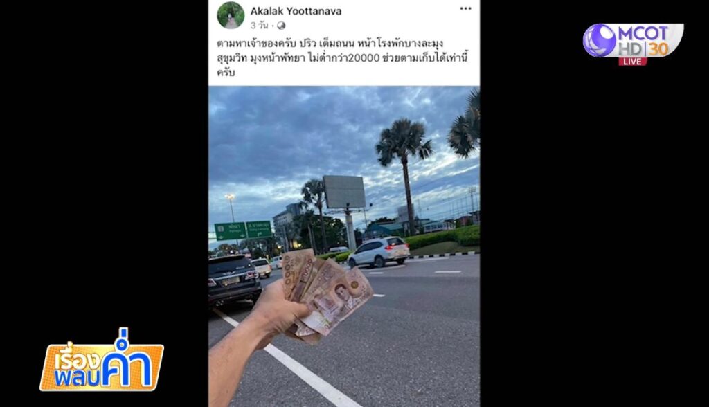 นายทนุพงศ์ ศรีแสนยงค์ ผู้อำนวยการโรงเรียนเมืองพัทยา 1 และนางนิรมล ศรีแสนยงค์ ครูชำนาญการประจำโรงเรียนเมืองพัทยา 6 เปิดเผยว่า วันเกิดเหตุขณะขับรถยนต์ส่วนตัวไปซื้อของและรับประทานอาหาร ขณะออกจากไฟแดง แยกโรงไม้ขีด ได้ประมาณ 200 เมตร ช่วงนั้นมีรถสัญจรจำนวนมาก ทำให้เคลื่อนตัวได้ช้า ระหว่างนั้นมีบิ๊กไบค์ สีดำ ทะเบียนป้ายแดง ขับขี่มาเพียง 1 คน ขี่แซงขึ้นทางด้านขวา สังเกตเห็นมีเงินจำนวนมากหล่นจากกระเป๋าคนขับหลายใบ เห็นเป็นแบงก์พันกระจายเกลื่อนท้องถนน พอมองกระจกหลังก็เห็นว่าผู้คนที่ขับรถตามหลังมาต่างพากันจอดรถแล้วลงไปเก็บเงิน จำนวนหลายสิบคน จึงตัดสินใจนำภาพจากกล้องหน้ารถ ไปมอบให้กับเจ้าหน้าที่ตำรวจ สภ.บางละมุง ซึ่งขณะที่นำภาพไปให้ตำรวจก็มีพลเมืองดีอีก 2 คน เป็นพนักงานโรงกลั่นน้ำมันไทยออยล์ และพนักงานขับรถขนเงิน ได้นำเงินที่เก็บได้มาส่งมอบให้ตำรวจเช่นกัน โดยคนแรกเก็บได้ 13,000 บาท ส่วนคนที่ 2 เก็บได้ 6,000 บาท รวมเป็นเงิน 19,000 บาท จึงตัดสินใจเข้าให้การกับตำรวจพร้อมกัน ซึ่งเหตุการณ์ครั้งนี้มั่นใจว่าจำนวนเงินที่หล่นจากกระเป๋า บิ๊กไบค์มีมากกว่า 3-4 หมื่นบาทอย่างแน่นอน จึงอยากฝากถึงเจ้าของเงินให้รีบติดต่อ สภ.บางละมุง มารับเงินคืนไป