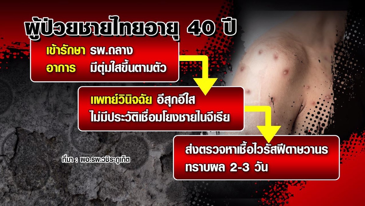 นพ.วีระศักดิ์ หล่อทองคำ ผู้อำนวยการโรงพยาบาลวชิระภูเก็ต เปิดเผยว่า กรณีมีผู้ป่วยชายไทย อายุ 40 ปี เข้ารับการรักษาในโรงพยาบาลถลาง ด้วยอาการมีตุ่มใสขึ้นตามตัว ล่าสุดจากการวินิจฉัยของทีมแพทย์ คาดป่วยเป็นอีสุกอีใส และไม่มีประวัติเชื่อมโยงกับชายชาวไนจีเรียที่ตรวจพบฝีดาษวานรเป็นรายแรกของไทย อย่างไรก็ตาม เพื่อความชัดเจน แพทย์ได้เก็บตัวอย่างส่งตรวจหาเชื้อไวรัสฝีดาษวานร ยังคณะแพทยศาสตร์ จุฬาลงกรณ์มหาวิทยาลัย คาดจะทราบผลภายใน 2-3 วันนี้