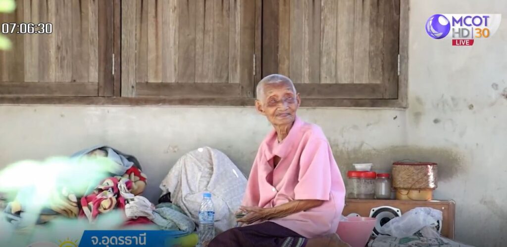 ผู้สื่อข่าวเดินทางไปที่บ้านดอนย่านาง ต.นาข่า อ.เมือง จ.อุดรธานี พบแม่เฒ่าบุญ อายุ 80 ปี นั่งอยู่บนแคร่ไม้บริเวณหน้าบ้านปูนชั้นเดียว