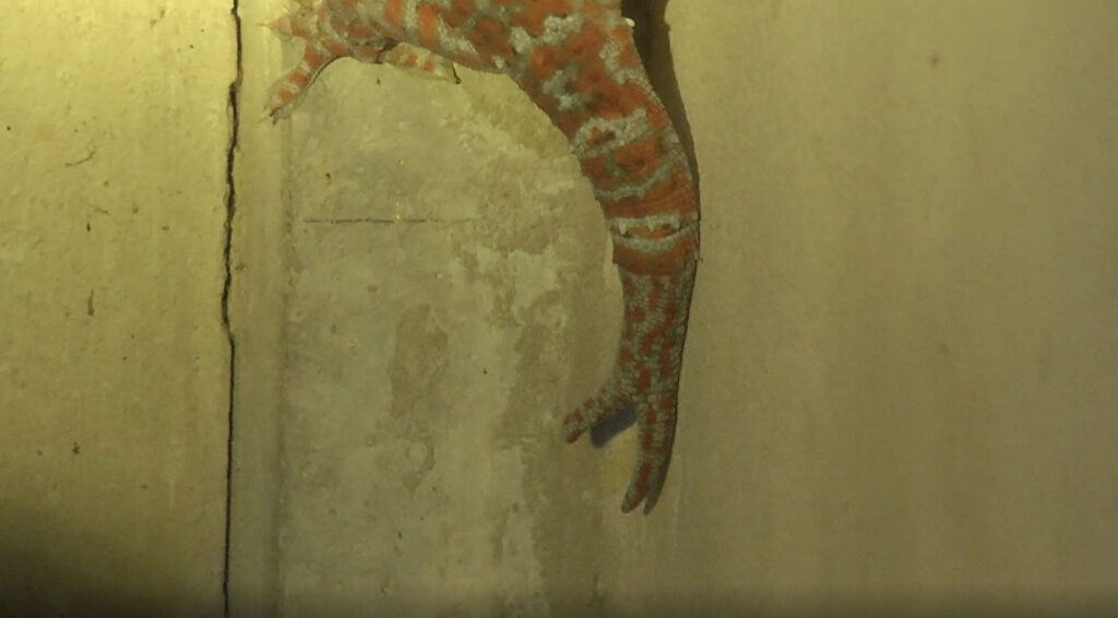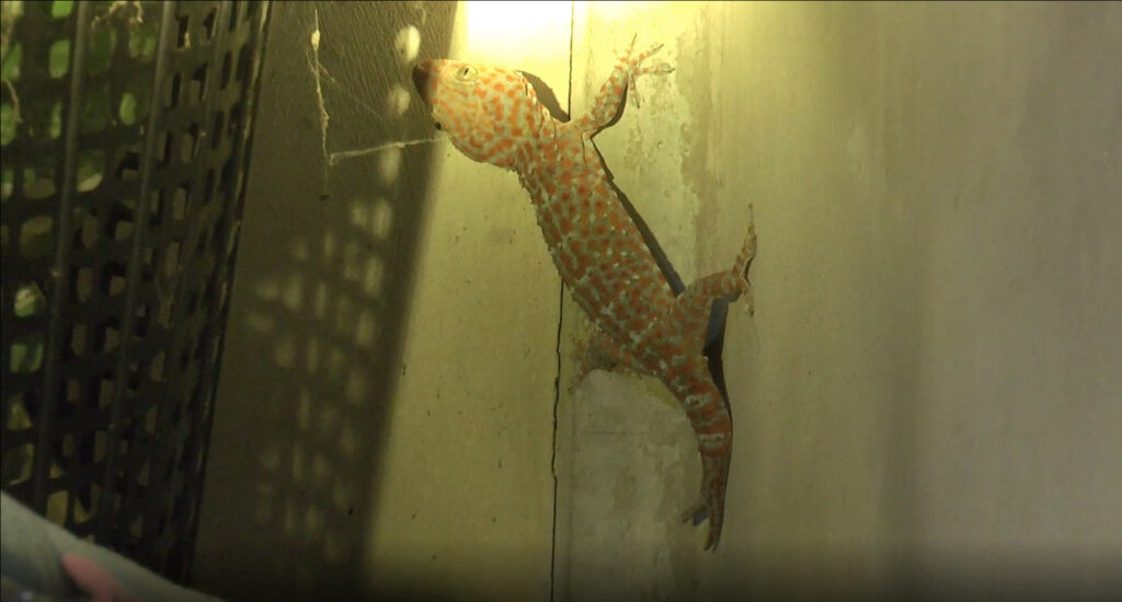 หลังพยายามค้นหาที่ตุ๊กแกซุกตัวจนสุดท้ายพบว่า เจ้าตุ๊กแก 2 หางแอบไปหลบอยู่หลังตู้เสื้อผ้า เป็นตุ๊กแกขนาดใหญ่ลำตัวอวบอ้วน มีปลายหางสองแฉกชัดเจน สีแดงส้มปนฟ้าต่างจากตุ๊กแกที่พบเห็นทั่วไป