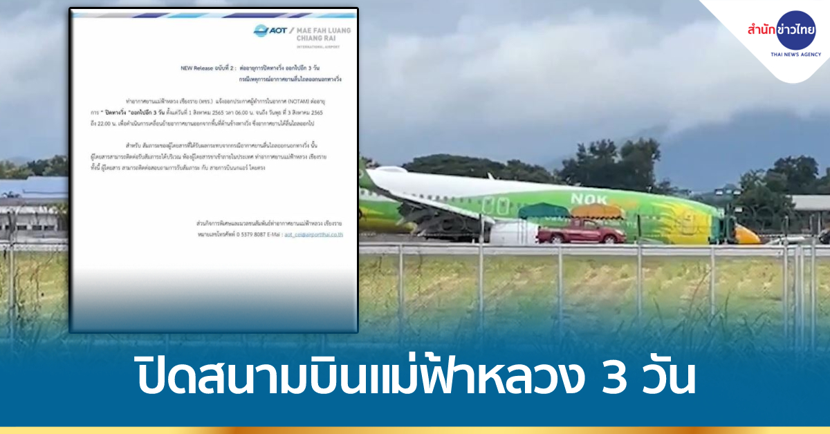 จากกรณีเครื่องบินไถลออกนอกรันเวย์ ทำท่าอากาศยานแม่ฟ้าหลวง เชียงราย แจ้งออกประกาศผู้ทำการในอากาศ หรือ NOTAM ต่ออายุการ “ปิดทางวิ่ง” ออกไปอีก 3 วัน ตั้งแต่วันที่ 1 สิงหาคม เวลา 06.00 น. จนถึงวันที่ 3 สิงหาคม เวลา 22.00 น. เพื่อเคลื่อนย้ายอากาศยานออกจากพื้นที่ด้านข้างทางวิ่ง ซึ่งอากาศยานได้ลื่นไถลออกไป