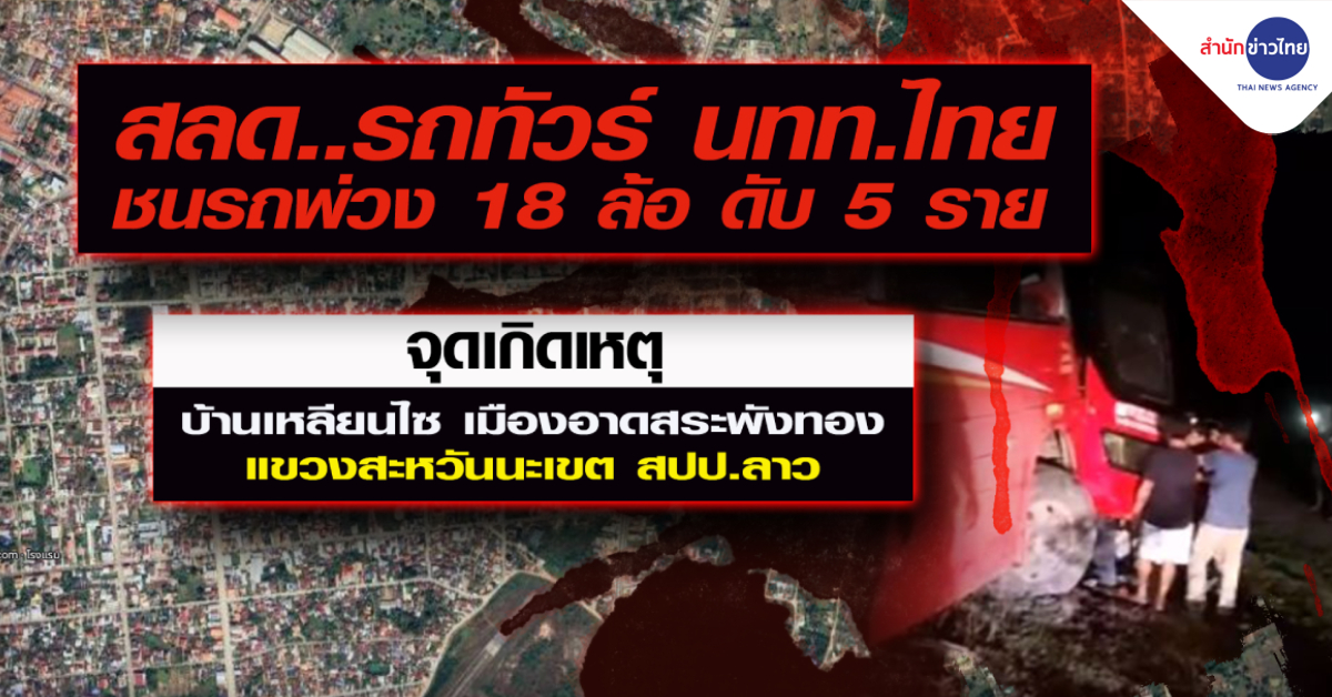 มุกดาหาร 1 ส.ค. – เกิดอุบัติเหตุรถทัวร์นักท่องเที่ยวชาวไทยชนกับรถพ่วง 18 ล้อ ของลาว มีผู้เสียชีวิต 5 ราย บาดเจ็บ 19 ราย ที่แขวงสะหวันนะเขต สปป ลาว