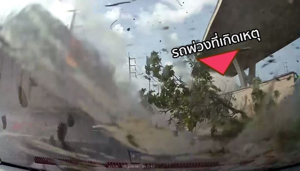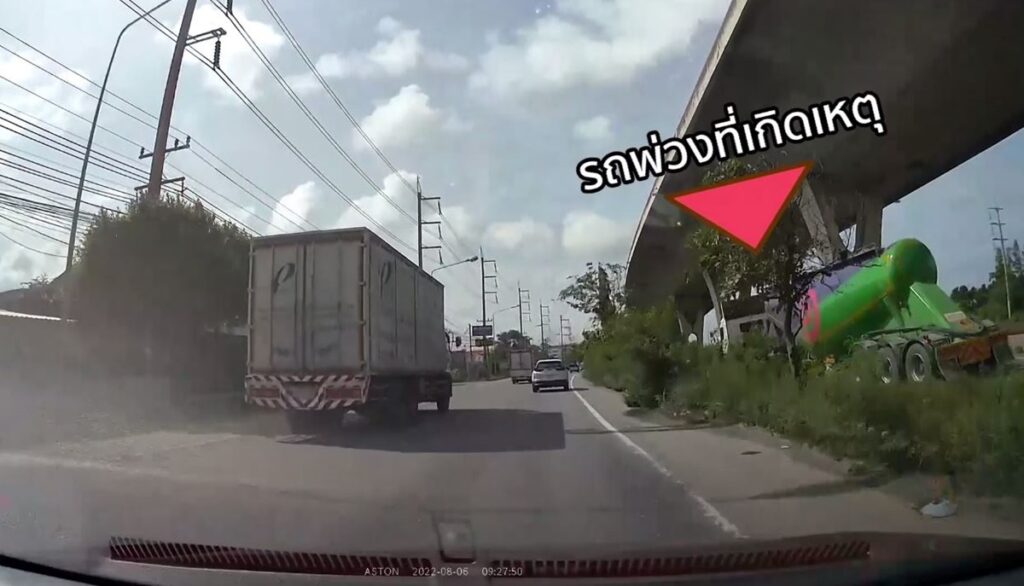 ภาพจากกล้องหน้ารถของ น.ส.อัจฉรา ที่ขับขี่อยู่บนถนนเทพรัตน (บางนา-ตราด) กม.40 ช่องคู่ขนาน ขาเข้าชลบุรี หมู่ 6 ต.บางวัว อ.บางปะกง จ.ฉะเชิงเทรา แสดงให้เห็นนาทีเกิดเหตุรถพ่วง 22 ล้อ บรรทุกผงปูน เสียหลักตกร่องน้ำข้างทาง ระหว่างช่องทางด่วนกับช่องคู่ขนาน ทำให้ น.ส.สุวรรณา คนขับได้รับบาดเจ็บ ส่วนนายสมบัติ คนนั่ง กระเด็นออกมานอกรถและตกลงไปในน้ำ พลเมืองช่วยเหลือได้ทัน และนำส่งโรงพยาบาลจุฬารัตน์ 11
