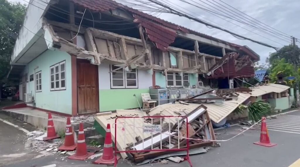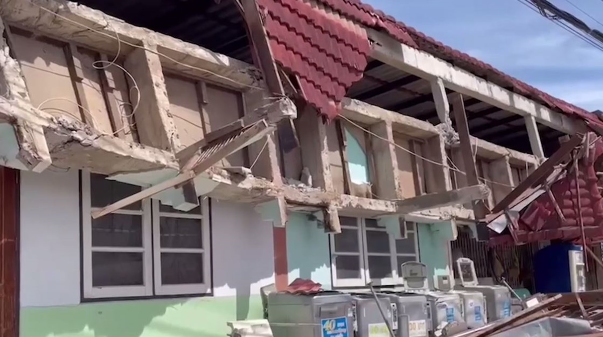 ชลบุรี 7 ส.ค. – เจ้าหน้าที่เร่งตรวจสอบโครงสร้างหลังคาทาวน์เฮาส์ 2 ชั้น ที่ อ.สัตหีบ จ.ชลบุรี หลังเกิดเหตุระทึกพังถล่มลงมา เบื้องต้นคาดเกิดจากพายุฝน ลมกระโชกแรง และสภาพอาคารเก่าทรุดโทรม