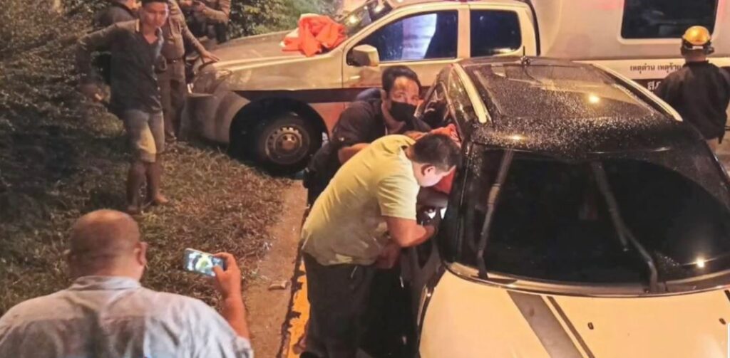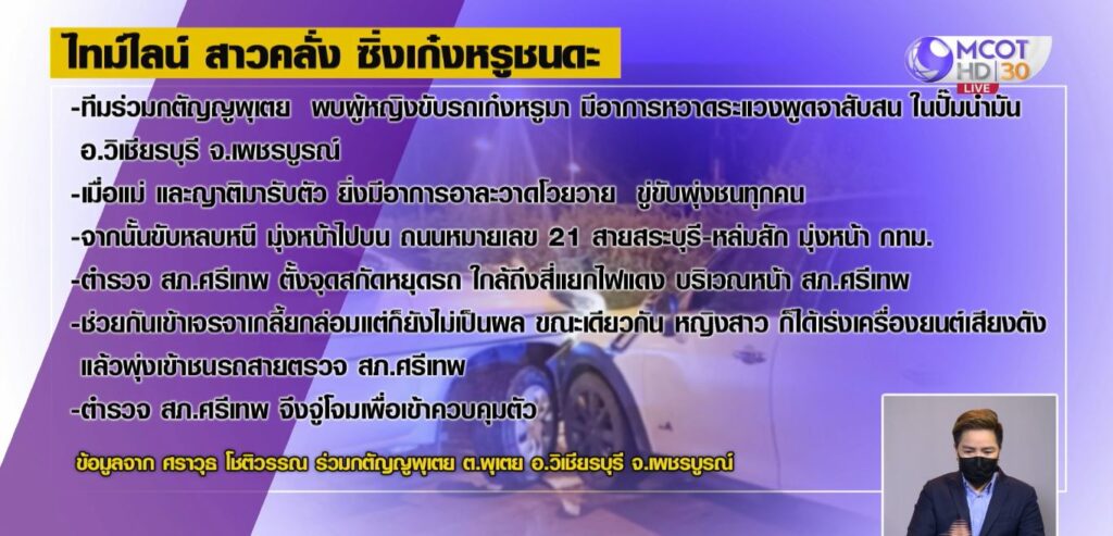 รถเก๋งมินิคูเปอร์ สีขาว ทะเบียนกรุงเทพมหานคร อยู่ในสภาพพุ่งชนฝั่งคนขับรถตำรวจสายตรวจ สภ.ศรีเทพ จ.เพชรบูรณ์ โดยมีรถตำรวจอีกคันปิดท้ายรถมินิคูเปอร์ เหตุเกิดใกล้ถึงสี่แยกไฟแดงบริเวณหน้า สภ.ศรีเทพ สภาพที่เห็นเกิดจากรถตำรวจพยายามสกัดรถมินิคูเปอร์ที่พยายามขับหลบหนี สอบสวนทราบว่าก่อนเกิดเหตุ เจ้าหน้าที่ร่วมกตัญญูได้รับแจ้งว่า มีหญิงขับรถมินิคูเปอร์มาคนเดียวอาการหวาดระแวงพูดจาสับสน จอดรถอยู่ภายในปั๊มน้ำมันพีที บ้านยางโด่ อ.วิเชียรบุรี จ.เพชรบูรณ์ จึงไปเจรจาไกล่เกลี่ยแต่ไม่เป็นผล จึงติดต่อญาติ