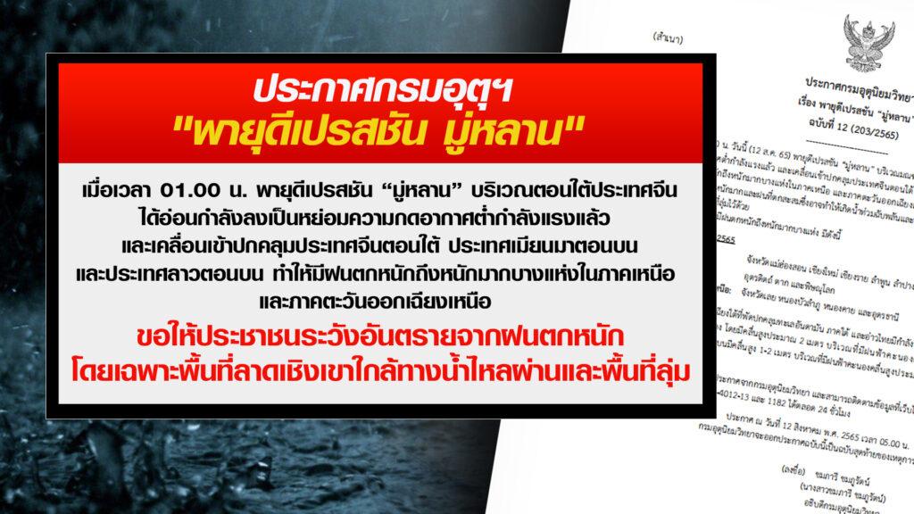 ขณะที่กรมอุตุนิยมวิทยาออกประกาศ “พายุดีเปรสชัน มู่หลาน” ฉบับที่ 12 โดยกรมอุตุนิยมวิทยาจะออกประกาศฉบับนี้เป็นฉบับสุดท้ายของเหตุการณ์นี้ ระบุว่า พายุดีเปรสชัน “มู่หลาน” ได้อ่อนกำลังลงเป็นหย่อมความกดอากาศต่ำกำลังแรงแล้ว และเคลื่อนเข้าปกคลุมประเทศจีนตอนใต้ ประเทศเมียนมาตอนบน และลาวตอนบน ทำให้มีฝนตกหนักถึงหนักมากบางแห่งในภาคเหนือ และภาคตะวันออกเฉียงเหนือ ขอให้ประชาชนระวังอันตรายจากฝนตกหนักถึงหนักมากและฝนที่ตกสะสมซึ่งอาจทำให้เกิดน้ำท่วมฉับพลันและน้ำป่าไหลหลาก โดยเฉพาะพื้นที่ลาดเชิงเขาและพื้นที่ลุ่มไว้ด้วย.-สำนักข่าวไทย