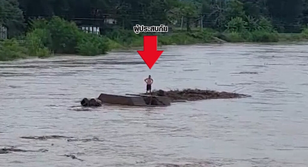 นาทีระทึก ชาวบ้านบันทึกคลิปนี้เอาไว้ หลังเห็นโป๊ะไม้ถูกพัดมาตามกระแสน้ำน่านที่มีสีแดงขุ่นและไหลเชี่ยว โดยมีชายคนหนึ่งติดอยู่บนโป๊ะ ชาวบ้านที่ยืนมองอยู่บนสะพานบ้านท่าค้ำ อ.ท่าวังผา จ.น่าน ต่างตะโกนบอกให้ระวังสายไฟ และให้ออกจากโป๊ะ เพราะถัดจากสะพานมีสายไฟระโยงระยางอยู่บนผิวน้ำ เมื่อโป๊ะไม้และชายคนดังกล่าวลอดผ่านใต้สะพานไปแล้ว ก็ถูกสายไฟเกี่ยวหลังคา จนโป๊ะค่อยๆ พลิกคว่ำจมน้ำ ส่วนชายที่อยู่บนโป๊ะก็ตกลงไปในน้ำต่อหน้าต่อตาชาวบ้าน ท่ามกลางเสียงกรีดร้อง กลัวว่าชายคนดังกล่าวจะจมหาย ไม่นานก็พบชายคนดังกล่าวโผล่หัวขึ้นมาจากน้ำ แล้วว่ายไปหาโป๊ะที่คว่ำอยู่ ก่อนจะปืนขึ้นไปยืนมองรอบๆ ด้วยความปลอดภัย .-สำนักข่าวไทย