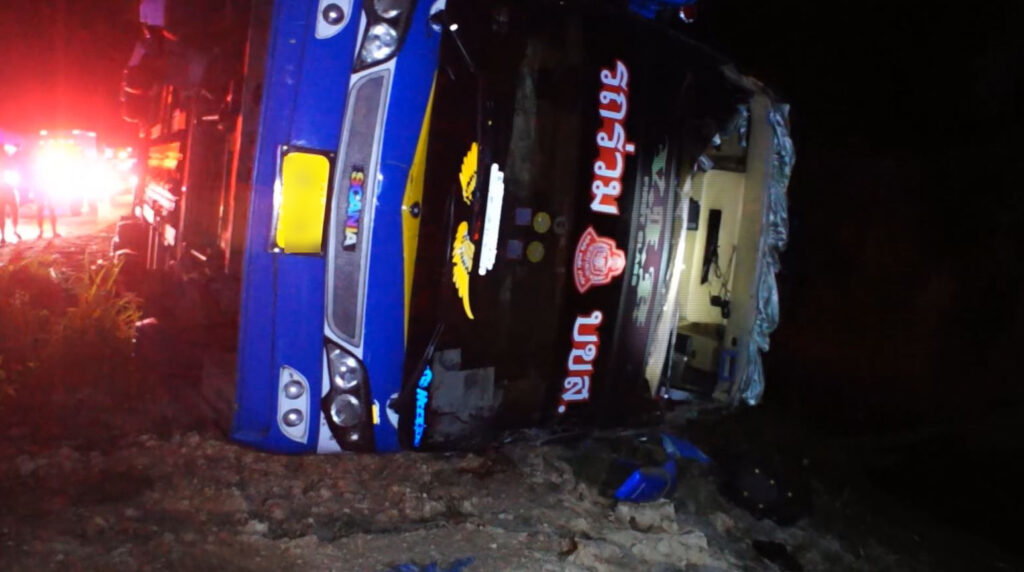 สอบสวนคนขับรถทัวร์ให้การว่ากำลังเดินทางไปที่กรุงเทพฯ แต่ล้อหน้าข้างขวาระเบิด ทำให้รถเสียหลักพลิกตะแคง สอดคล้องกับผู้โดยสารคนหนึ่งบอกว่าได้ยินเสียงดังปัง! ก่อนที่คนขับจะพยายามประคองรถ แต่สุดท้ายกลับพลิกตะแคง.-สำนักข่าวไทย