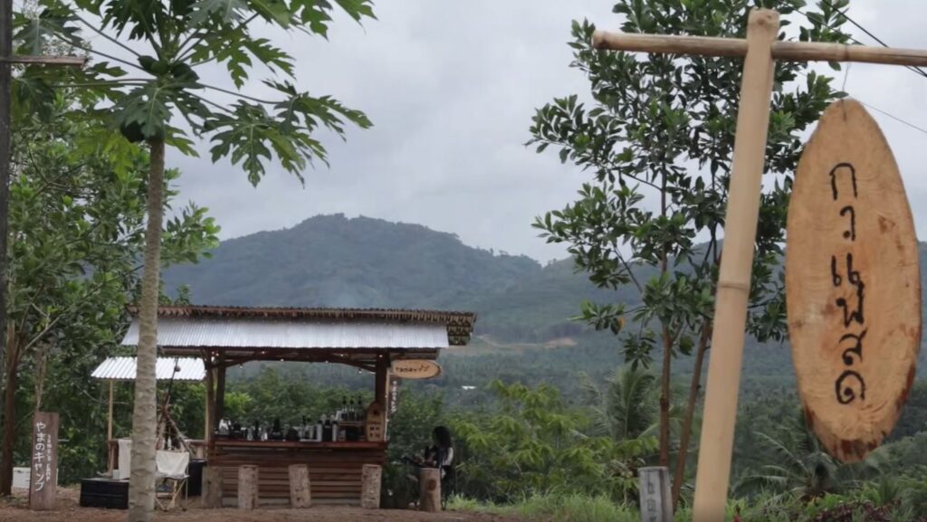 สำหรับชื่อร้านเป็นภาษาญี่ปุ่น อ่านว่า “ยะมะโน๊ะ เคียมพุ” คำว่า ยะมะโน๊ะ แปลว่าภูเขา ส่วนคำว่า เคียมพุ แปลว่า แคมป์ ซึ่งก็จะเข้ากันกับบรรยากาศร้านท่ามกลางป่าเขาลำเนาไพร นักท่องเที่ยวสามารถเปิดเป็นแคมปปิ้งเล็ก ๆได้ด้วย “จุดเด่นของร้านมาจากไอเดียความคิดให้ผสมกลมกลืนกับบรรยากาศท่ามกลางธรรมชาติในพื้นที่ ซึ่งยังไม่มีใครทำร้านกาแฟลักษณะนี้ และที่สำคัญตนเองมีความรู้เรื่องของการทำเครื่องดื่มอยู่แล้ว และชอบชงเครื่องดื่ม คิดค้น ดัดแปลงรสชาติและเมนูต่าง ๆ รวมไปถึงใส่ใจเลือกใช้วัตถุดิบ และอุปกรณ์ที่ใช้ชงเครื่องดื่มเทียบเท่ากับร้านกาแฟหรูระดับ 5 ดาวเลยทีเดียว นอกจากเครื่องดื่มแล้ว เจ้าของร้านจะใช้ช่วงว่างระหว่างที่ลูกค้ายังไม่มา เขียนข้อความคำคม ในแต่ละแก้วไว้ เพื่อให้ลูกค้าได้อ่านเมื่อสั่งเครื่องดื่ม หากว่างจากการชงกาแฟให้ลูกค้า แม่ค้าคนสวยอารมณ์ดี ก็จะหยิบเอากีตาร์คู่ใจมาบรรเลงแบบสบาย ๆ ให้ลูกค้าฟังด้วย ใครอยากมาชมวิวหลักล้าน มาได้ที่ร้าน “Yama’s CAMP” จ.ชุมพร. – สำนักข่าวไทย