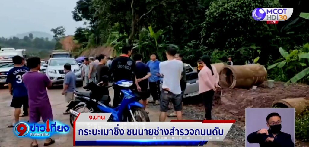 น่าน 26 ก.ย. – ช่างสำรวจถนนกำลังทำงานก่อสร้างทางอยู่ข้างถนนสายน่าน-บ้านหลวง อำเภอเมืองน่าน จังหวัดน่าน ถูกรถกระบะ พุ่งชนอย่างแรง จนทำให้มีผู้เสียชีวิต 1 ราย และยังสาหัสอีก 1 ราย