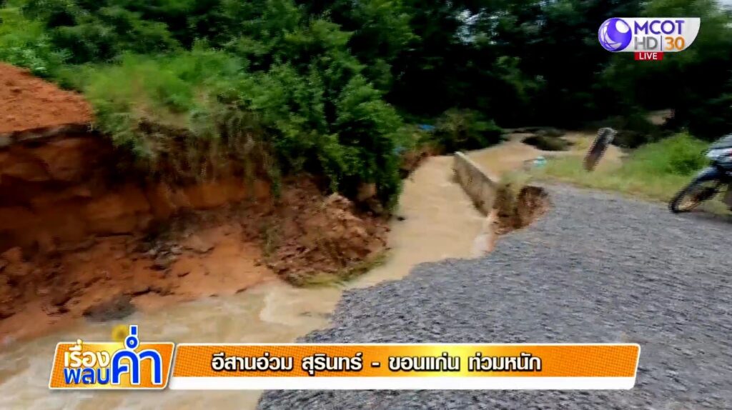 ภูมิภาค 26 ก.ย. – อิทธิพลพายุฝนที่ตกอย่างต่อเนื่อง ทำให้ภาคอีสาน น้ำท่วมหนักทั้งตัวเมือง และถนนบางจุดมีน้ำท่วมสูงกว่า 1 เมตร ทั้งจังหวัดสุรินทร์ ขอนแก่น ท่วมหนักหลายพื้นที่ รถผ่านไม่ได้ ขณะที่ปริมาณน้ำในอ่างเก็บน้ำหลายแห่งเต็มความจุ และล้นสปิลเวย์แล้ว