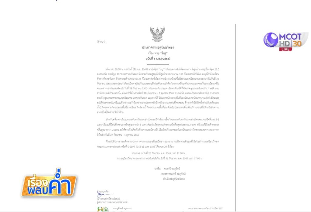 ด้านกรมอุตุฯ ออกประกาศเตือนพายุโนรู ฉบับที่ 5 โดยบอกว่าขณะนี้ไต้ฝุ่น “โนรู” บริเวณทะเลจีนใต้ตอนกลาง กำลังเคลื่อนตัวไปทางทิศตะวันตก ด้วยความเร็วประมาณ 26 กม./ชั่วโมง และคาดจะเคลื่อนขึ้นฝั่งประเทศเวียดนามตอนกลางในวันที่ 28 ก.ย. ก่อนอ่อนกำลังลงเป็นพายุโซนร้อนและพายุดีเปรสชัน โดยจะเคลื่อนเข้าปกคลุมภาคตะวันออกเฉียงเหนือตอนกลางของประเทศไทยในวันที่ 29 ก.ย. ประกอบกับมรสุมตะวันตกเฉียงใต้ที่พัดปกคลุมทะเลอันดามัน ภาคใต้ และอ่าวไทย จะมีกำลังแรงขึ้น ส่งผลทำให้ในช่วงวันที่ 28 ก.ย.- 1 ต.ค.ทั่วทุภาคของไทยจะมีฝนตกหนักหลายพื้นที่ และมีฝนตกหนักมากบางแห่งกับมีลมแรง ซึ่งอาจทำให้เกิดน้ำท่วมฉับพลันและน้ำป่าไหลหลาก