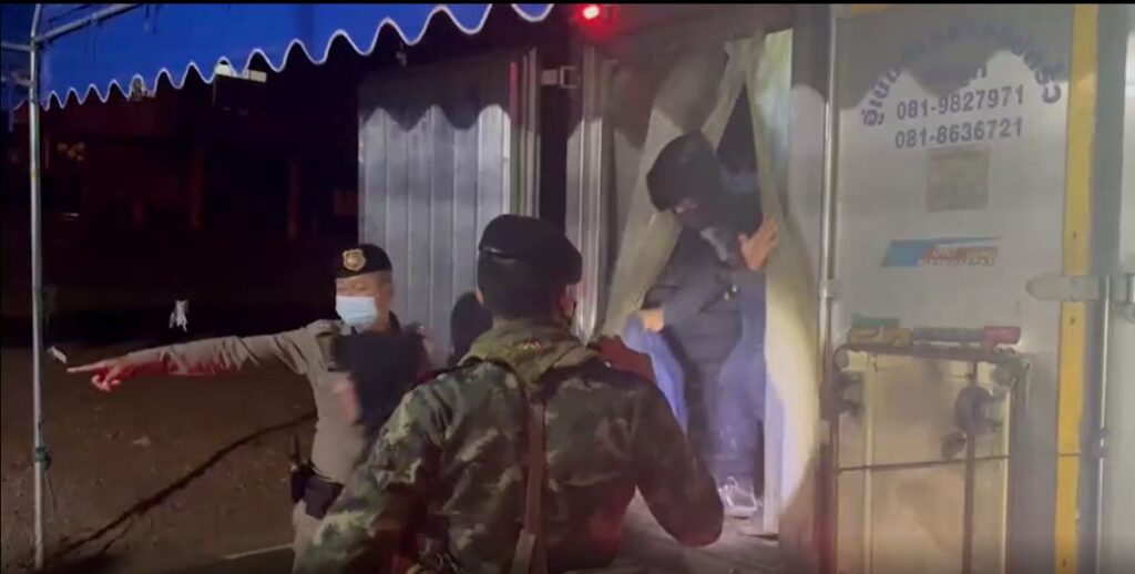 ตำรวจ สภ.ทองผาภูมิ ตรวจค้นกระบะทึบดัดแปลงเป็นรถส่งอาหารทะเล ทะเบียน 2 ฒษ 2559 กรุงเทพฯ และทะเบียน 3ฒง 5163 กรุงเทพฯ ที่ขับตามกันมาบนถนนสาย 3272 ห้วยเขย่ง-ทองผาภูมิ ต.ท่าขนุน จึงขอตรวจค้นพบแรงงานต่างด้าวชาวเมียนมาชายหญิงนั่งแออัดกันมาเต็มคันรถทั้ง 2 คัน รวม 39 คน โดยคันแรกมีนายใบ เอี่ยมรัมย์ อายุ 45 ปีชาว อ.แม่วงก์ จ.นครสวรรค์ เป็นคนขับ บรรทุกแรงงานมา 21 คน ส่วนอีกคันมีแรงงานต่างด้าวอยู่ 18 คน มีนายศรายุทธ เอี่ยมรัมย์ อายุ 33 ปี ชาว ต.เมืองฝาง อ.เมืองบุรีรัมย์ จ.บุรีรัมย์ เป็นคนขับ
