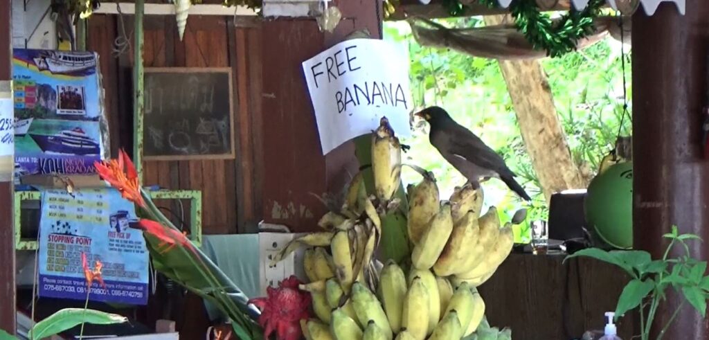 ตรัง 30 ก.ย. – เจ้าของเกาะมุกการ์เด้นท์บีชรีสอร์ท วางกล้วยน้ำว้าไว้ 1 เครือ เพื่อให้นักท่องเที่ยวชาวต่างชาติได้กินฟรี โดยเขียนเป็นภาษาอังกฤษว่า Free Banana แต่มีนกเอี้ยงตัวหนึ่งบินเข้ามาจิกกินกล้วยอย่างหน้าตาเฉยเป็นเวลาหลายนาทีกลายเป็นภาพน่ารักที่มีให้เห็นเกือบทุกวัน