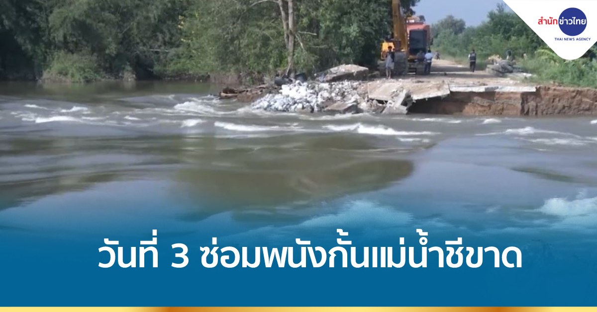 เข้าสู่วันที่ 3 ในการซ่อมแซมพนังกั้นแม่น้ำ ที่บ้านสะดำศรี อำเภอฆ้องชัย จังหวัดกาฬสินธุ์ ขณะนี้เจ้าหน้าที่ได้นำแท่งปูน มาเตรียมชะลอความแรงของน้ำ เพื่อหยุดการกัดเซาะพนังกั้นน้ำไม่ให้ขยายวงกว้างออกไป ซึ่งจุดที่พนังขาดมีความกว้างอยู่ที่ขนาด 50 เมตร และไม่มีการพังทลายเพิ่มอีก
