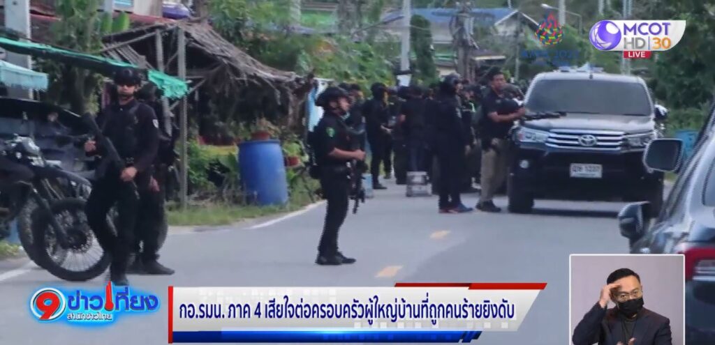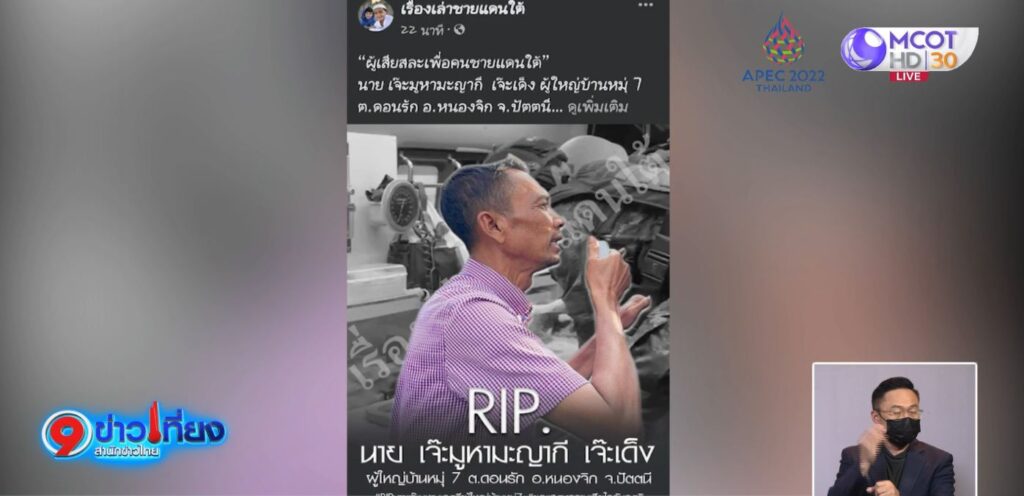 ปัตตานี 8 พ.ย. – กอ.รมน.ภาค 4 ส่วนหน้าแถลงเสียใจต่อครอบครัวผู้ใหญ่บ้าน อ.หนองจิก จ.ปัตตานี หลังเข้าร่วมการปิดล้อมร่วมกันเจ้าหน้าที่ แต่ถูกคนร้ายยิงเสียชีวิต